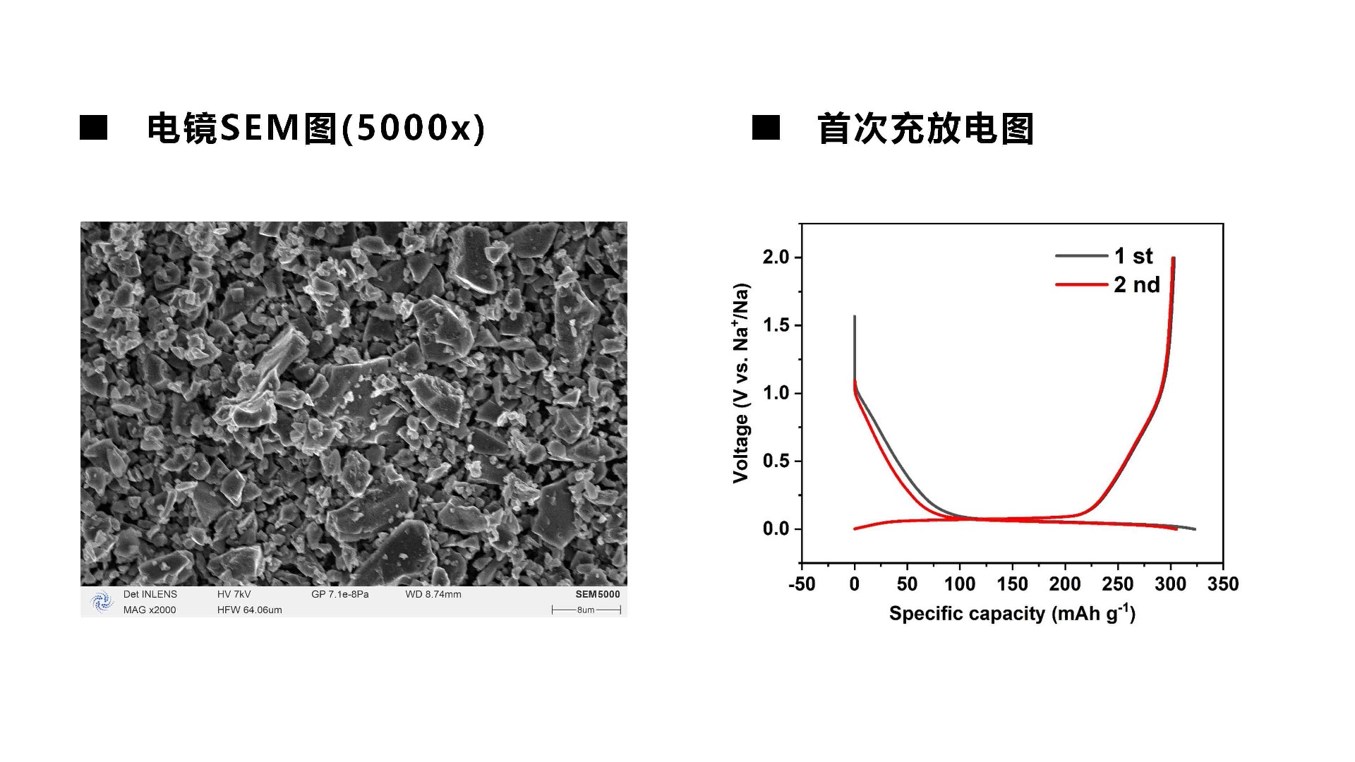 检测项目 					 						单位 					 						标准 					 						典型值 					 						测试仪器与方法 					 						  					 						  					 						粒径 					 						D10 					 						µm 					 						≥2 					 						3.45 					 						  					 						激光衍射法,英国马尔文MS2000 型粒度分析仪 					 						D50 					 						µm 					 						4~15 					 						4.93 					 						D90 					 						µm 					 						≤45 					 						16.96 					 						振实密度 					 						g/cm3 					 						≥0.6 					 						  					 						0.77 					 						参考 GBT 24533-2019用振实密度仪测试 					 						粉末压实密度 					 						g/cm3 					 						≥0.8 					 						  					 						1.09 					 						参考GBT24533-2019用压实密度仪测试 					 						灰分 					 						% 					 						 					 						  					 						0.25 					 						灼烧失重法:样本量:2g;马弗炉800℃ ,5-6小时至恒重 					 						水分 					 						% 					 						≤0.5 					 						  					 						0.27 					 						参考GB/T 6283-2008用卡尔费休水分测定仪测试 					 						比表面积 					 						m2/g 					 						≤5.0 					 						4.39 					 						多点BET法,国仪量子UltraSorb 3803系列微孔分析仪,吸附质:N2 					 						  					 						电化学性能 					 						可逆容量 					 						mAh/g 					 						≥300 					 						303.4 					 						半电池测试,蓝电多功能电池测试系统 					 						MIKROUNA双工位手套箱,H20≤0.0lppm,02≤0.0lppm 					 						放电效率 					 						% 					 						≥90 					 						  					 						93.99